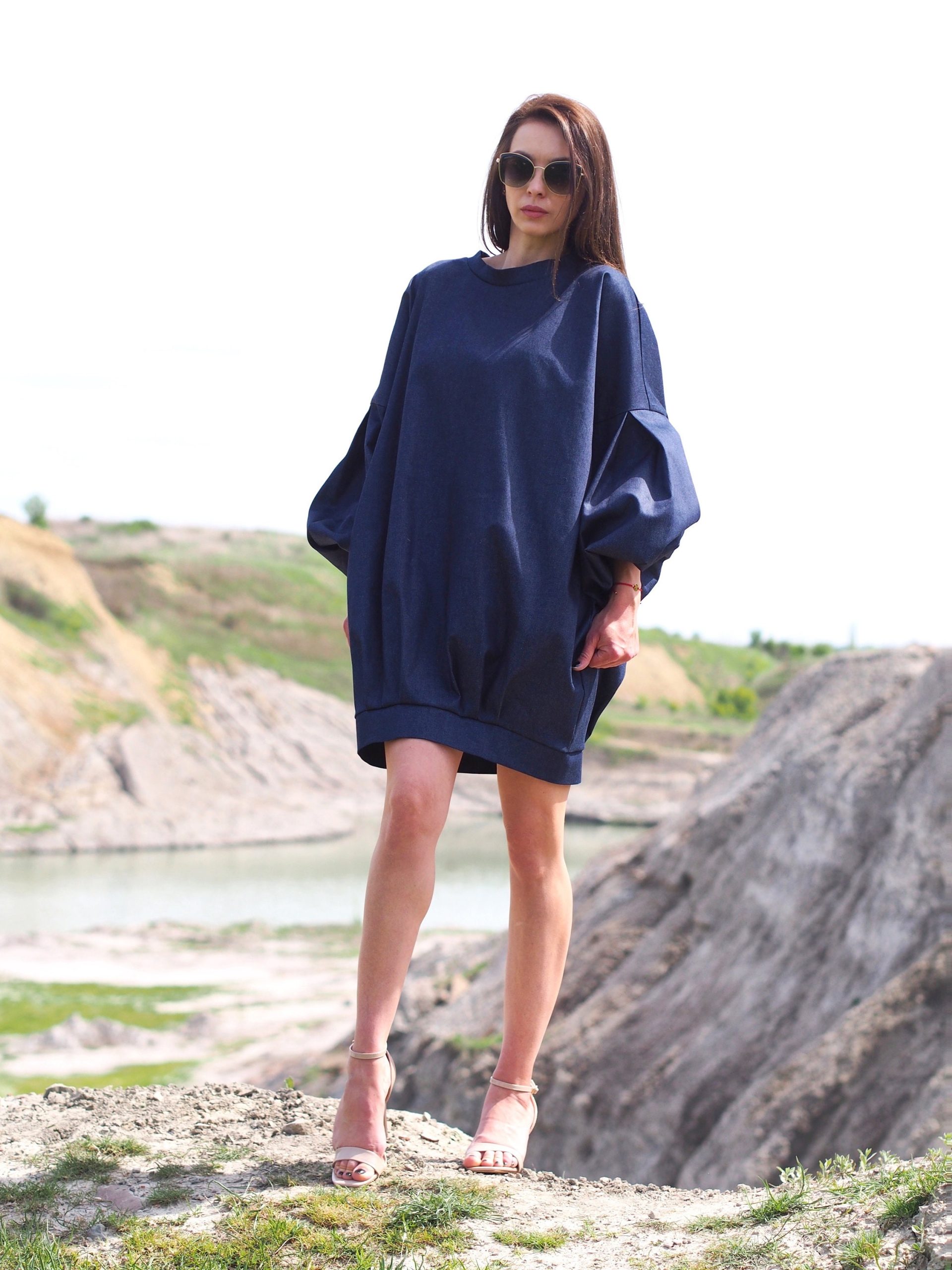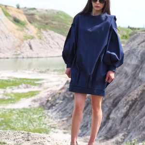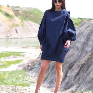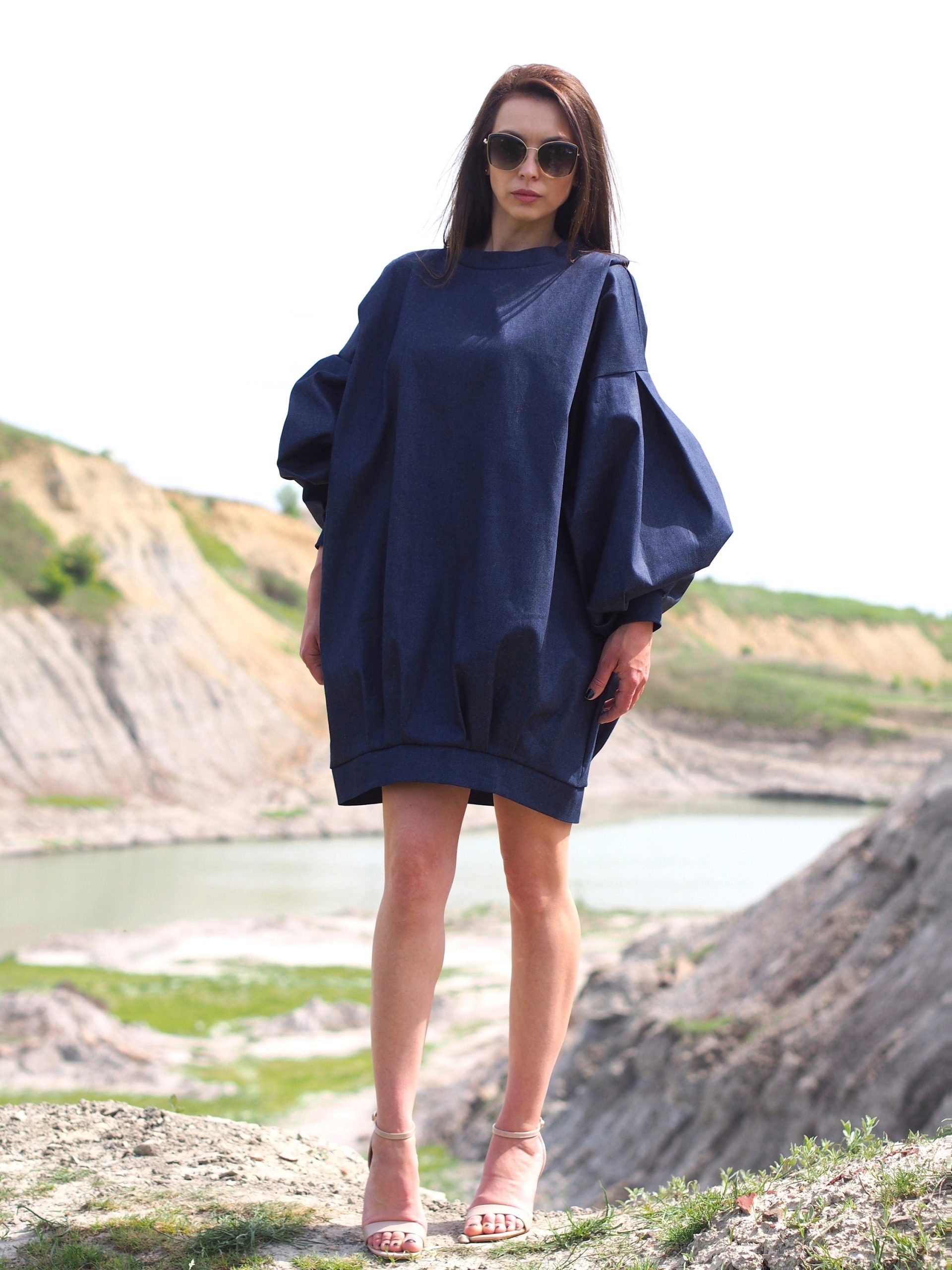 Oversized Denim Balloon Sleeve Dress Minimalist Dark Blue