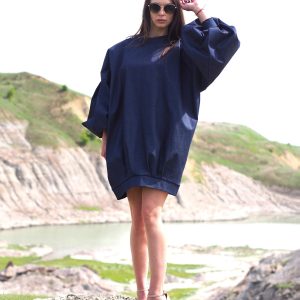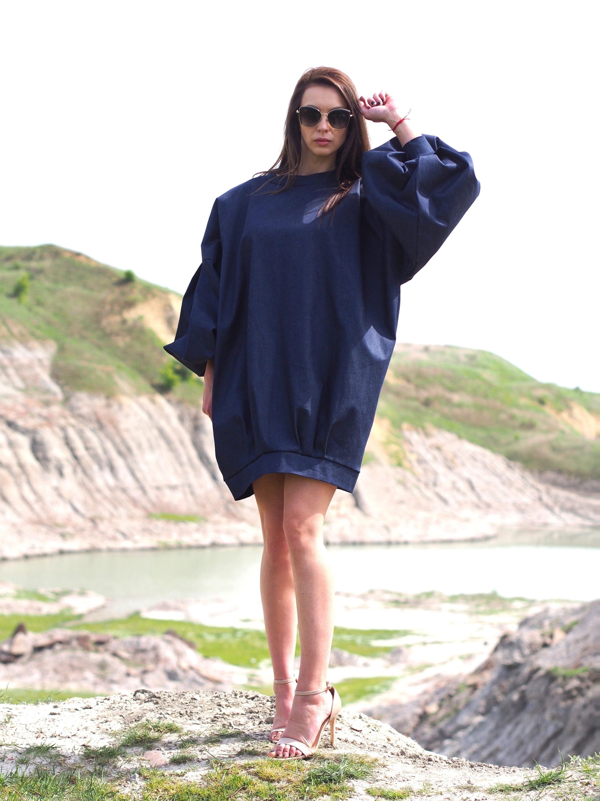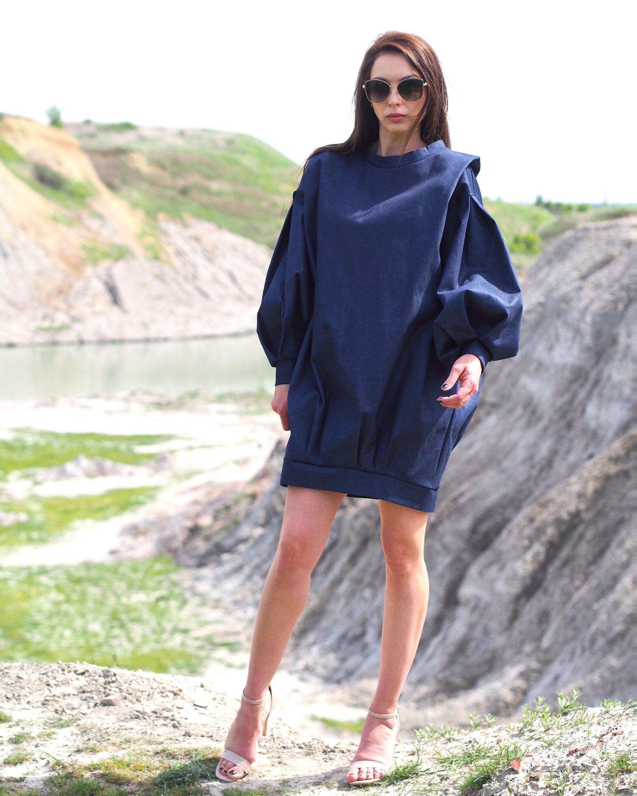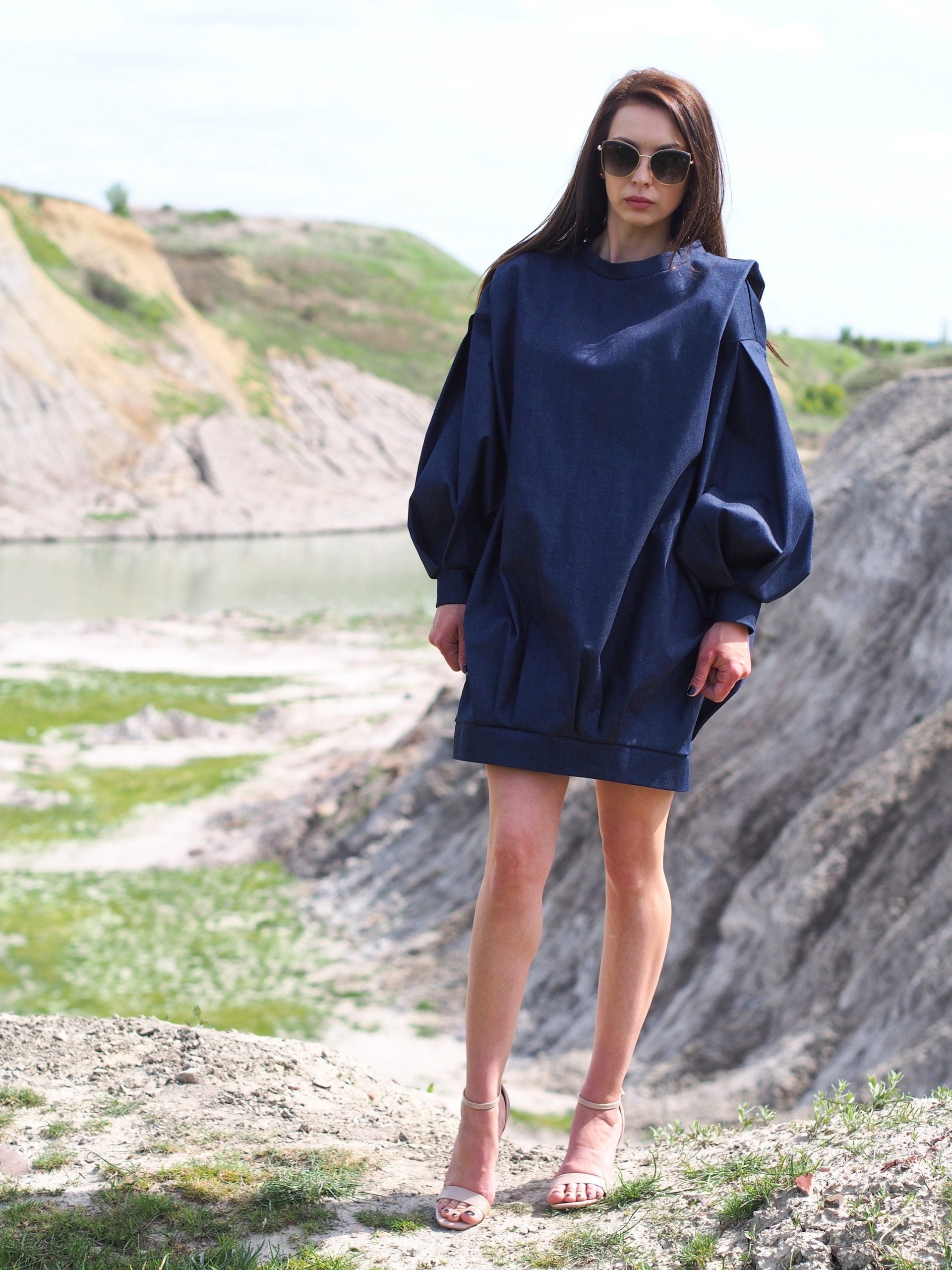 Oversized Denim Balloon Sleeve Dress Minimalist Dark Blue