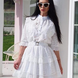 Feminine short lace dress with tiered A-line silhouette